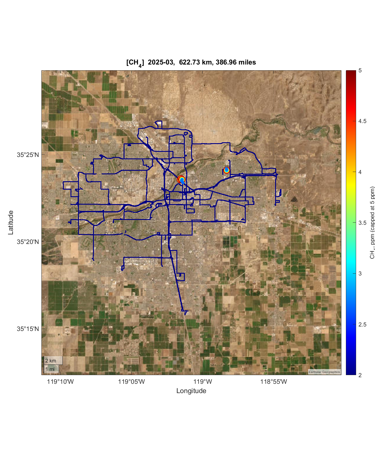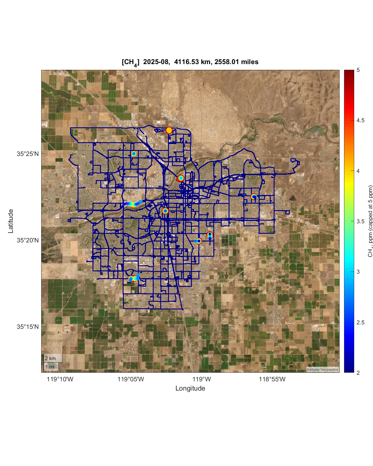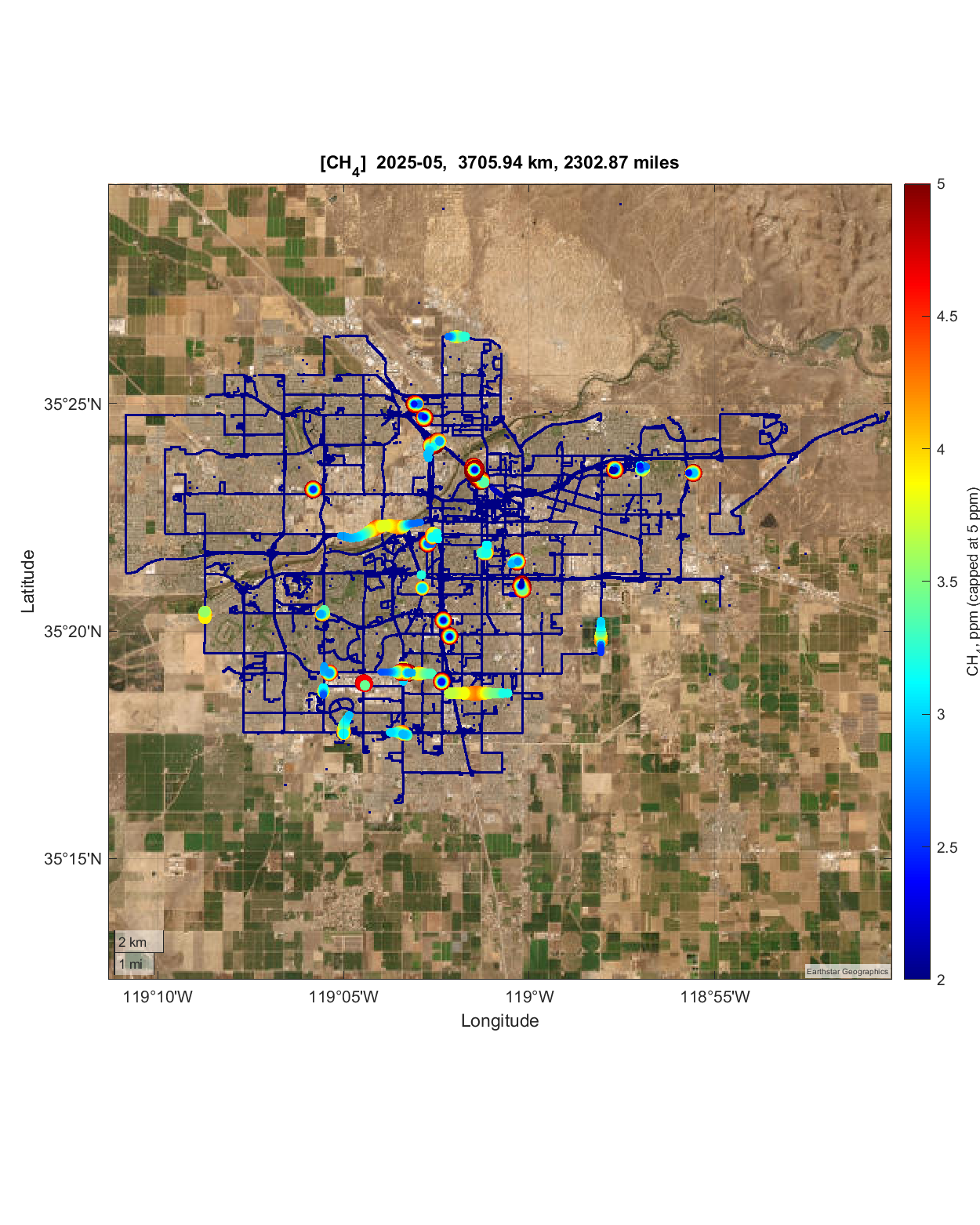 Around 3,435 miles of road in the Bakersfield metropolitan area were covered during the campaigns carried out to date using our mobile survey platforms. The spatial variability of methane concentrations recorded is represented on the Earth’s surface using the longitude and latitude of each measurement.